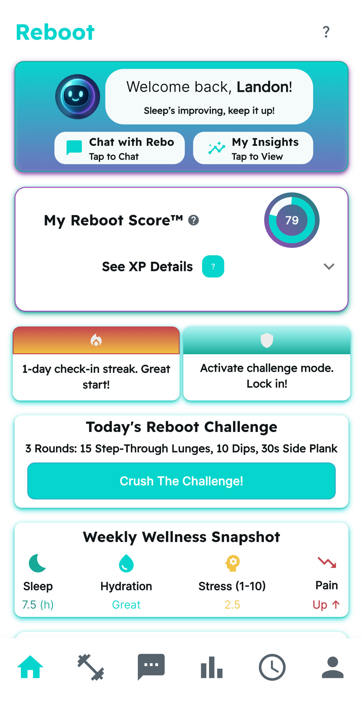 From your personalized Reboot Score™ to daily challenges and fitness goals, everything is built to work together. Reboot helps you measure what matters.