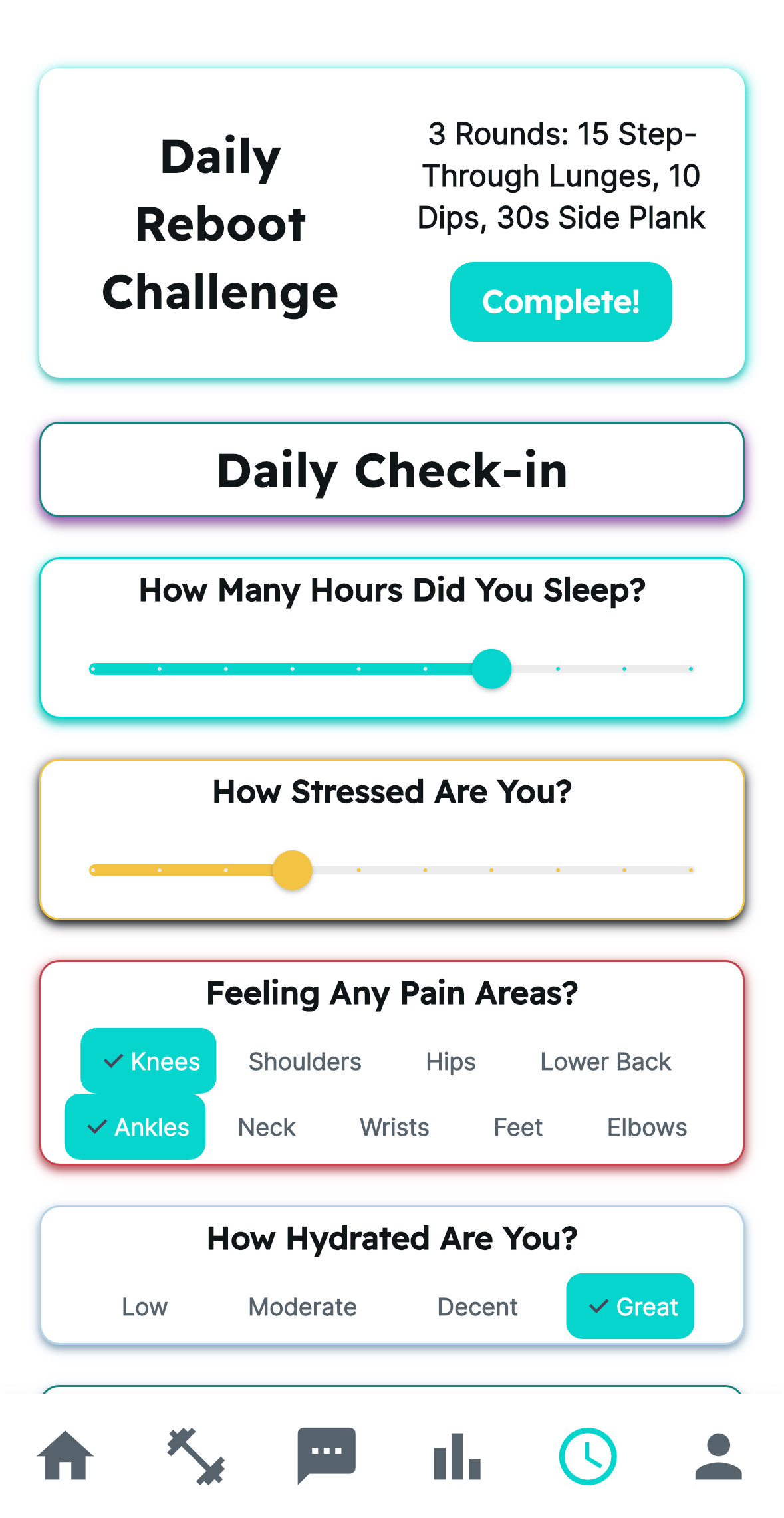 Big transformations start with tiny, consistent wins. Your Daily Reboot gives you one challenge and a quick wellness check-in, building momentum, rewarding consistency, and making progress automatic.